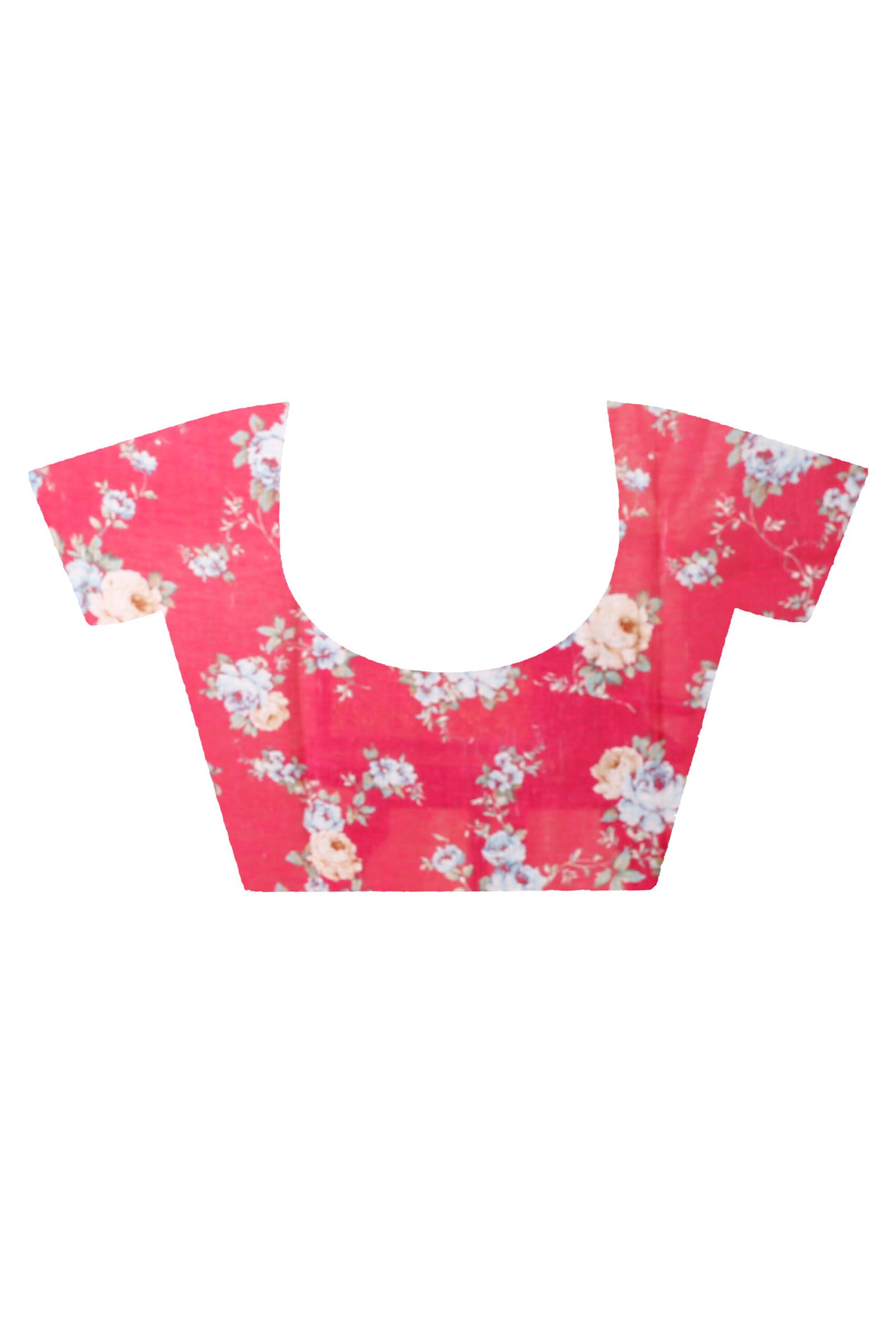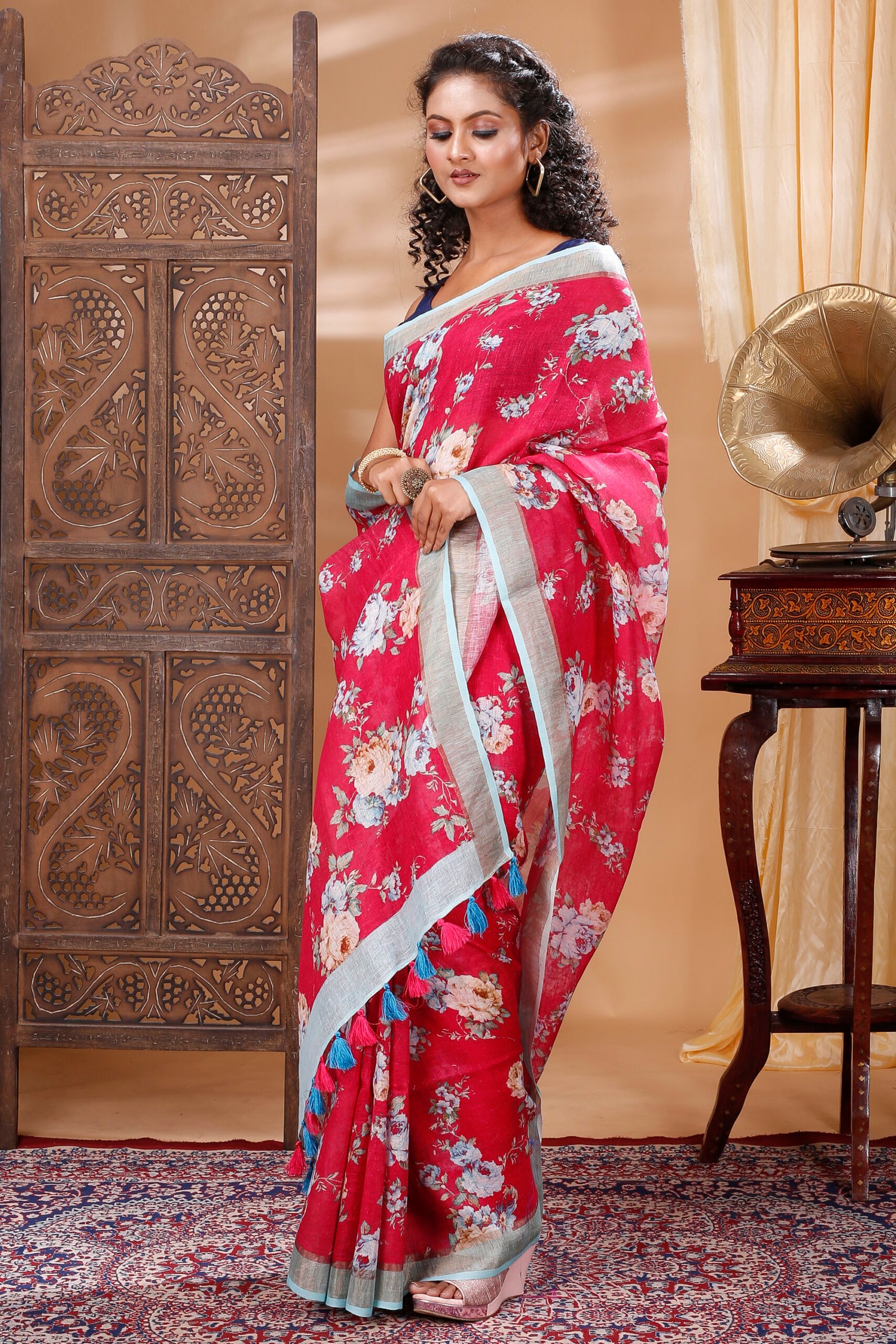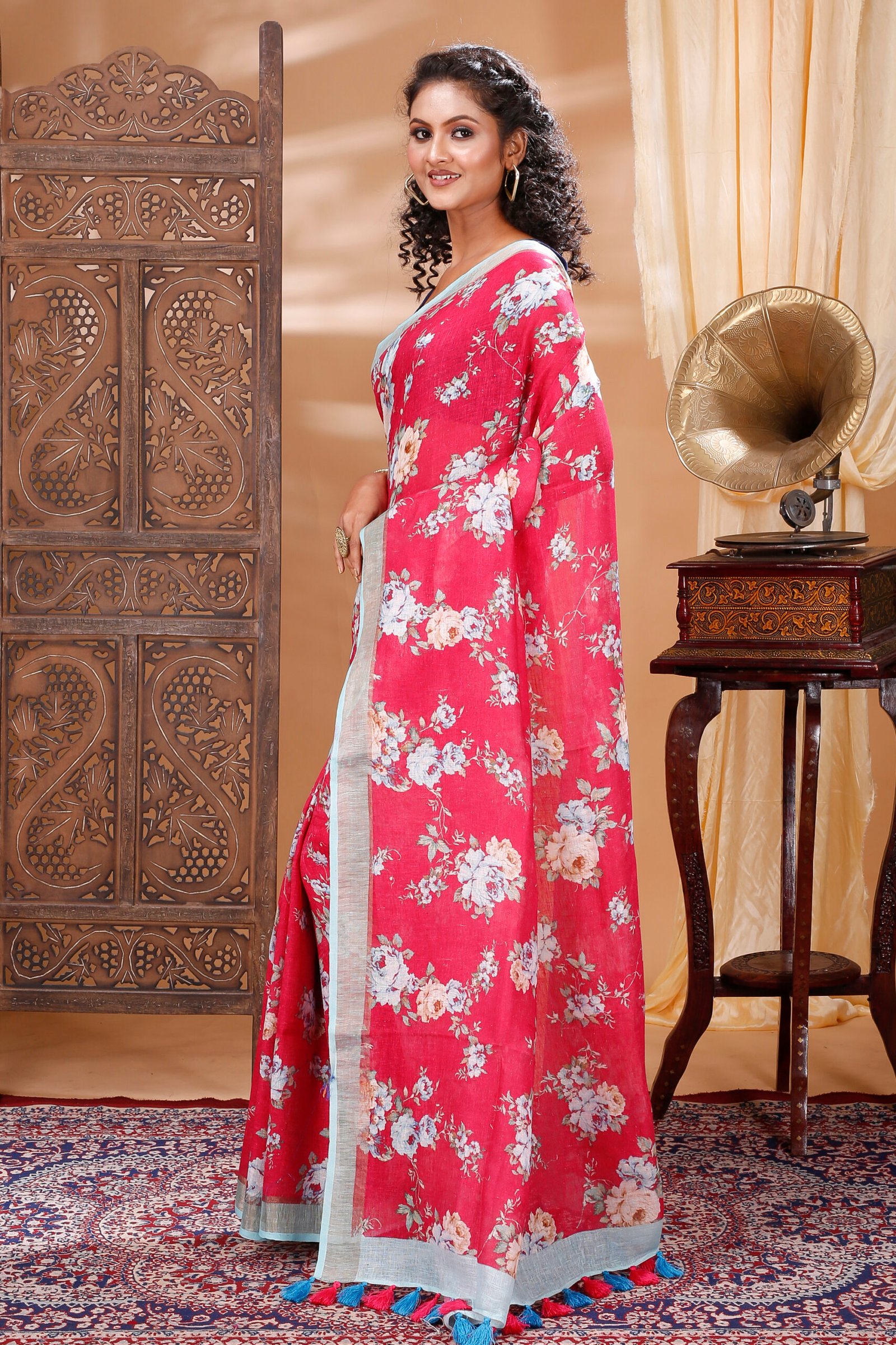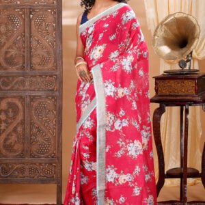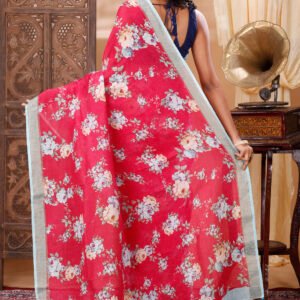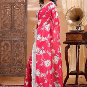 A soothing red linen saree adorned with delicate floral prints, offering effortless elegance and lightweight comfort for everyday grace.